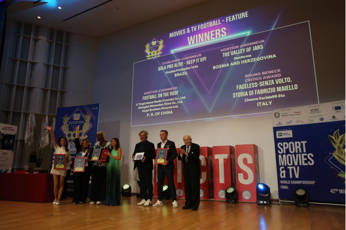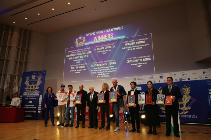 第42届米兰国际体育电影电视节总决赛于11月5日至11月9日在意大利米兰举行。11月9日晚,总决赛颁奖典礼在米兰伦巴第大区礼堂举行,近600名来自世界各国的体育电影工作者齐聚一堂,共同庆祝各奖项的揭晓。由北京国际体育电影周推选的中国体育影片《嗨,亚运——她们》《看不见的顶峰》获得金花环大奖,《屋顶足球》《空手道的起源》获得提名奖。北京奥运城市发展促进会副秘书长王琨、北京奥运城市发展促进中心发展研究部副部长李海红作为片方代表领取金花环大奖。