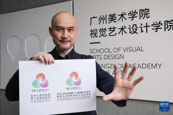 十五运会会徽和吉祥物设计团队负责人、广州美术学院视觉艺术设计学院副院长刘平云介绍十五运会和残特奥会会徽绽放的视觉效果(11月9日摄)。