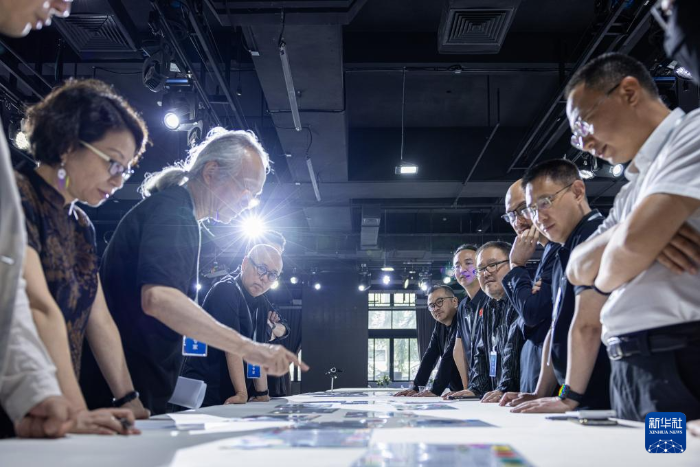 十五运会和残特奥会的吉祥物评审委员会主任赵健(左二)和评委讨论吉祥物设计方案(6月15日摄)。新华社发