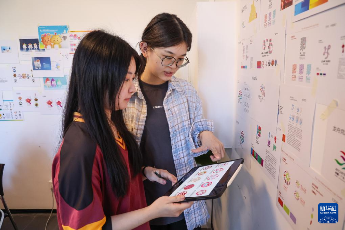 广州美院刘平云设计团队成员探索对十五运会和残特奥会会徽的后期应用方案(11月9日摄)。新华社记者 刘大伟 摄