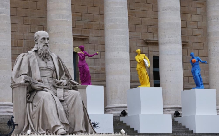 巴黎奥运会开幕前在法国巴黎国民议会前拍摄的奥运主题雕像