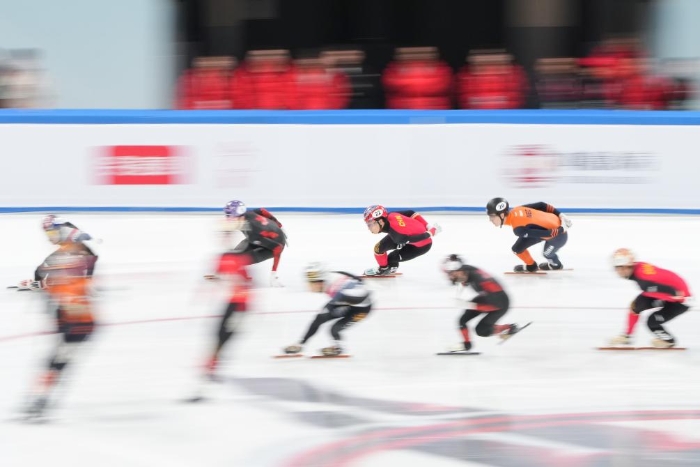 2024年12月8日,中国队选手孙龙(后排右二)在短道速滑世界巡回赛北京站男子5000米接力决赛中。新华社记者 鞠焕宗 摄