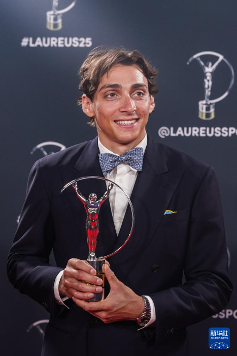 4月21日,获得年度最佳男运动员奖的瑞典撑杆跳高运动员杜普兰蒂斯手捧奖杯留影。