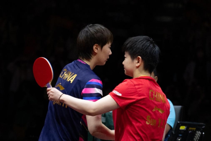 王曼昱(左)与孙颖莎赛后互相致意。 新华社记者 肖艺九 摄