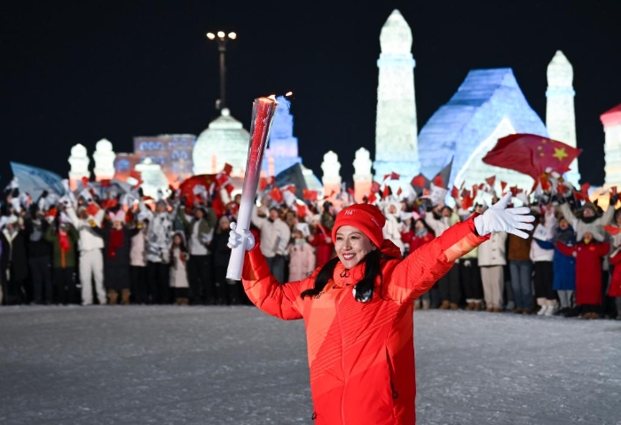 第九届亚洲冬季运动会开幕式上,杨扬作为第一棒火炬手传递火炬。新华社记者 李嘉南 摄