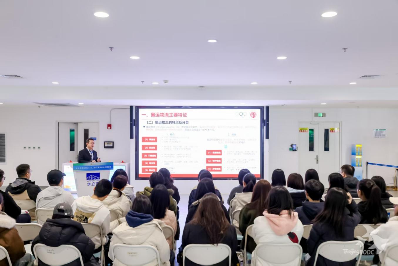 开幕式后,举办了“双奥文化大讲堂”。北京物资学院物流学院院长姜旭携《奥运物流》一书给50名同学带来了一堂精彩的现场公开课。《奥运物流》是北京物资学院物流学院院长姜旭教授主笔,与团队老师历时三年撰写而成的第一部将“双奥”实践经验提炼为赛事物流“中国智慧”与“中国方案”的系统性专著,为未来奥运会及大型国际赛事组织者物流管理提供了有益的参考。该书英文版预计于2026年达喀尔青奥会前出版。姜旭教授简要而精炼地向学生讲述了2008年北京奥运会从奥运村的建设物资,到赛时数万人的生活保障,再到每一件竞赛器材的精准交付,物流是如何贯穿于奥运筹办和举办的全过程。授课结束后,国家游泳中心赛时物流业务领域物资主管老师向师生们实地讲解介绍了场馆奥运物流工作区。此次“双奥文化大讲堂”也是继本月初北京奥运城市发展促进中心和北京物资学院签署战略合作框架协议后,利用北京物资学院物流学院学生实践周开展的“双奥文化·运河思政”课堂共建第一次活动。
