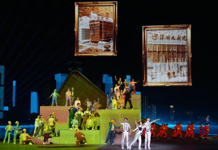 舞台上,象征改革开放历程的建设者们接力登场,劈山跨海,筑路架桥。他们带着梦想南下,以敢闯敢试、敢为人先、埋头苦干的特区精神,闯出一片新天地。