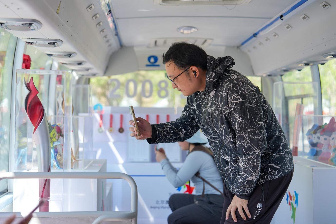 (Visitors and runners take photos in front of the “Olympic Culture Caravan.”)