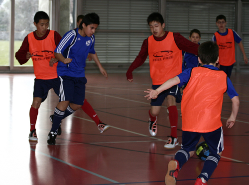 28日,北京的6名小足球运动员与洛桑市的中学生足球队进行混编,组成蓝色、橙色、红色三支球队,展开了足球友谊赛。赛后,小球员们相互交换小礼物,学语言,交流球场战术和脚法,兴奋的心情溢于言表。