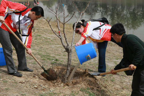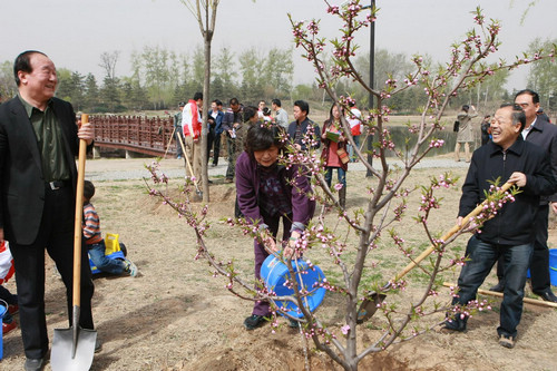 2011年4月9日,艳阳高照,春风拂面。200多名北京奥运人,身着北京奥运会红色祥云图案工作服,前往圆明园遗址公园“曲院风荷”景区,为一年前在那里种植的230株碧桃和21株柳树培土、浇水,滋养这个全市首个以奥运为主题的林木群----“北京奥运纪念林”。全国政协教科文卫体委员会副主任、北京奥运城市发展促进会副会长蒋效愚,中国残疾人联合会副主席、中国残疾人福利基金会理事长汤小泉参加活动。
