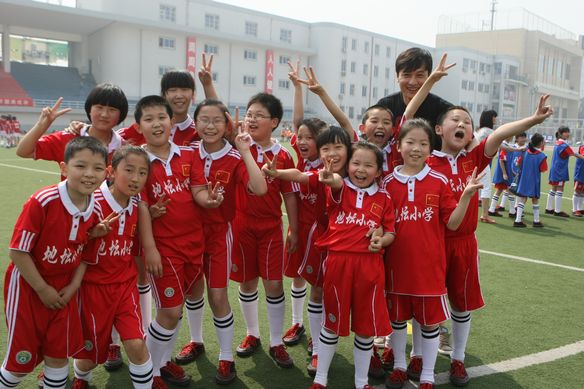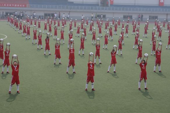 小学生做广播体操很常见,但是足球操你见过吗?6月18日上午的北京地坛体育中心足球场,随着欢快激情的音乐,400名来自地坛小学的学生,身穿红色足球服,每人手持一个足球,向现场观众展示了一场别开生面的足球操。这是“奥运城市杯”2011北京市中小学校足球日活动现场的一幕。“我快乐 我健康 我运动”是本次活动的主题口号。