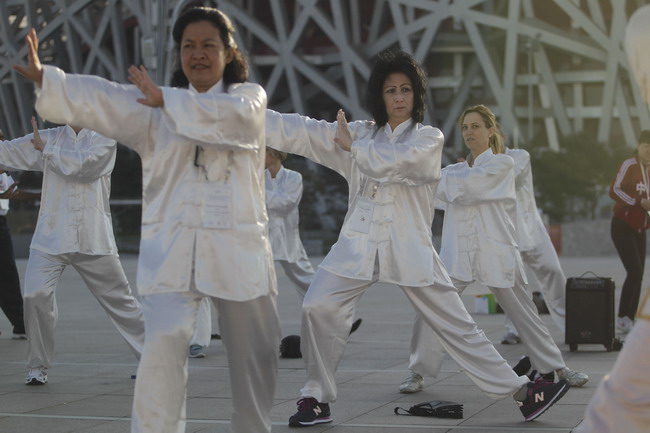 晨练活动吸引了参会代表的积极参与,他们身着组委会专门准备的太极拳服装,在鸟巢和水立方之间的广场上,在北京阳光明媚的秋日里,接受由北京语言文化大学专职教练用英语教授的太极拳。