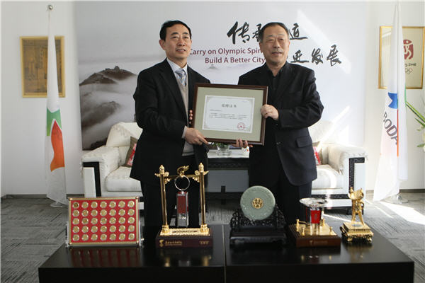繁荣文化是北京奥运会的特许生产商,此次向奥促会赠送圣火盆、火种灯等北京奥运会特许产品5件,用于北京奥运财富的传承与中国文化宣传工作。张凤朝同志代表奥促机构接受捐赠,并向繁荣文化颁发捐赠证书。
