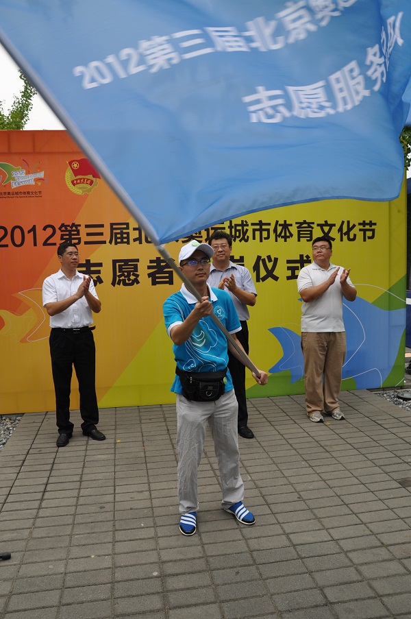 仪式上,与会领导为志愿者代表佩戴了工作证,团市委机关党委书记、志愿服务指导中心主任郭新保同志为第三届北京奥运城市体育文化节志愿服务队授旗,参与过第二届体育文化节的志愿者代表钟智同学与全体志愿者分享了自己的志愿服务感受,表达了北京志愿者对伦敦奥运的祝福,并代表全体志愿者表示将秉承“奉献、友爱、互助、进步”的志愿服务理念,不断创新,不断进步,热情服务、无私奉献,为第三届体育文化节贡献我们的力量与智慧,续写奥运志愿者的辉煌与传奇,让志愿者的微笑永远成为北京最好的名片。随后,志愿者们面对队旗庄严宣誓,“将竭尽所能,参加公益活动,帮助困难人群,真诚关怀有需要的人士,为他们带来温暖。”仪式结束后志愿者们迈着整齐的步伐前往志愿岗位,开始了第一天的志愿服务。