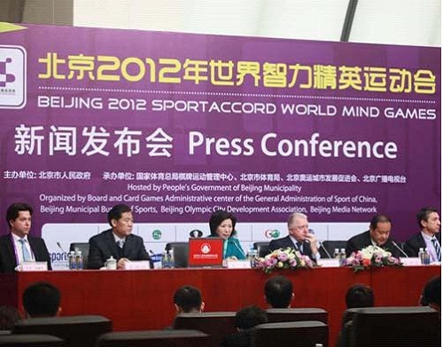 今天上午赛事组委会举行新闻发布会,世界体育总会主席海因.维尔布鲁根,北京2012世界智力精英运动会组委会