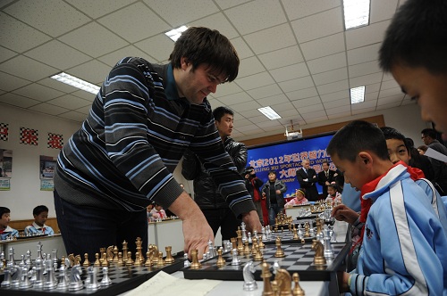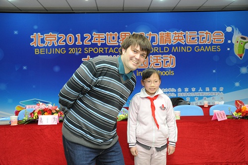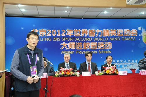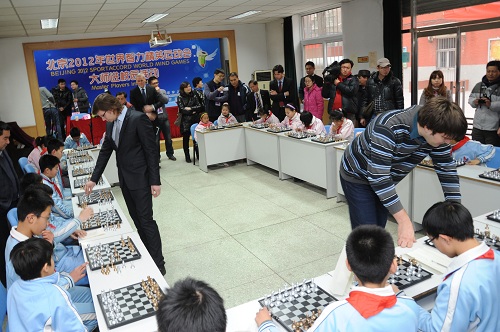 2012年12月13日下午,北京2012年世界智力精英运动会国际象棋进校园交流活动在国际象棋特色校——北京市朝阳区定福庄第四小学进行。北京奥运城市发展促进会副秘书长赵卫、世界体育总会执委会委员Espend Lund、世界体育总会体育部主任David Nivelle、国际象棋协会的秘书长和大师出席了这次活动。交流活动在两位国际象棋大师Peter Heina Nielsen和BartekHeberla以及27名小学生之间进行,每名大师分别对阵13名和14名学生。面对大师,同学们神情自若、走法认真,棋风缜密。比赛进行地精彩激烈,来自定福庄四小的杨惠仪沉着应战,最终成为唯一战胜大师的小选手。