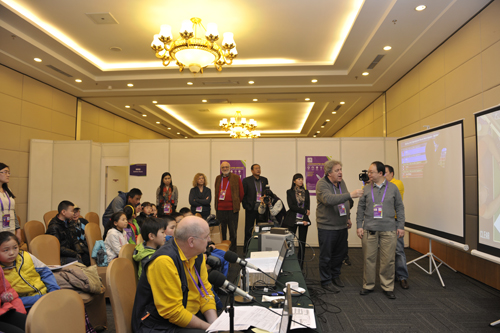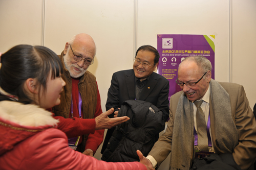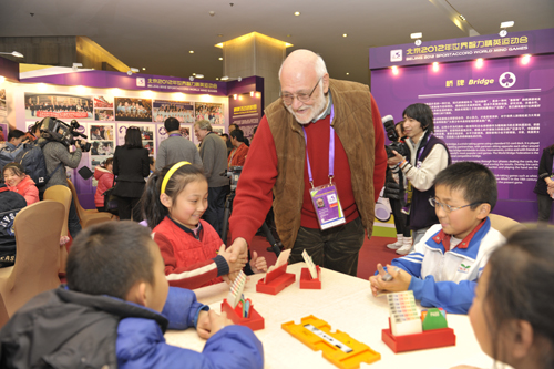 12月15日下午,朝阳区和平街中心小学的20名小同学来到北京2012年世界智力精英运动会现场参加观摩活动。世界桥牌联合会主席加纳里戈·罗纳、世界体育总会官员以及世界桥牌联合会形象大使布林克与同学们进行了友好的交流。北京奥运城市发展促进会秘书长吴京汨出席了活动。