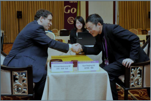 在线比赛围棋项目优胜者孙乃经六段(右)对阵美国选手迈克·雷蒙九段