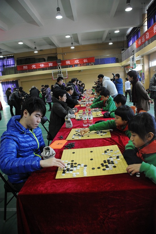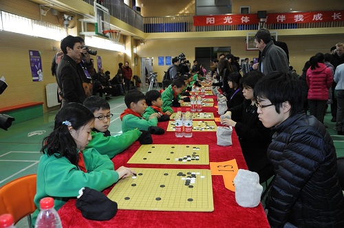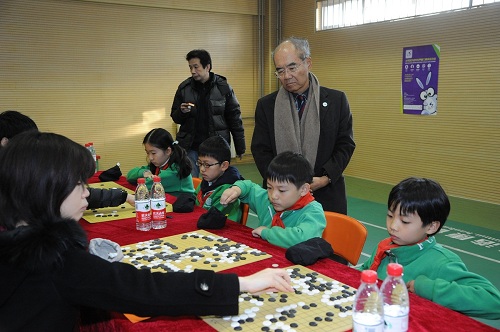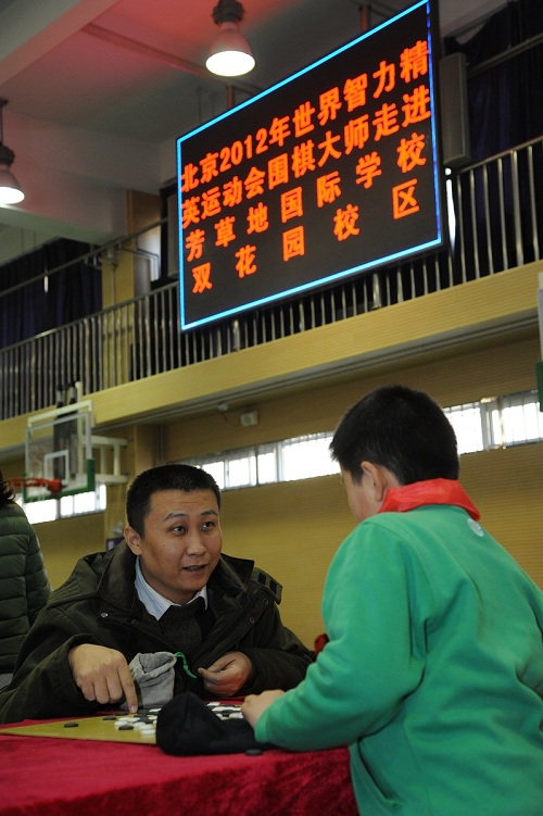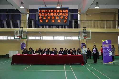12月17日下午,应邀来京参加北京2012年世界智力精英运动会的15名围棋大师走进北京市芳草地国际学校双花园校区,与那里的围棋小选手对弈交流。北京奥运城市发展促进会副秘书长、北京2012年世界智力精英运动会组委会副主席赵卫,世界体育总会副主席扬·弗朗索、总干事文森特•盖拉德,世界围棋协会主席松浦晃一郎以及市教委相关负责同志参加了活动。