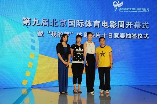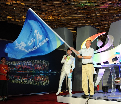 8月8日下午,第九届北京国际体育电影周开幕式在“鸟巢”金色大厅举行。北京奥运城市发展促进会副会长王伟宣布第九届北京国际体育电影周开幕并向“我的梦”体育短片十日竞赛的10位导演组授旗