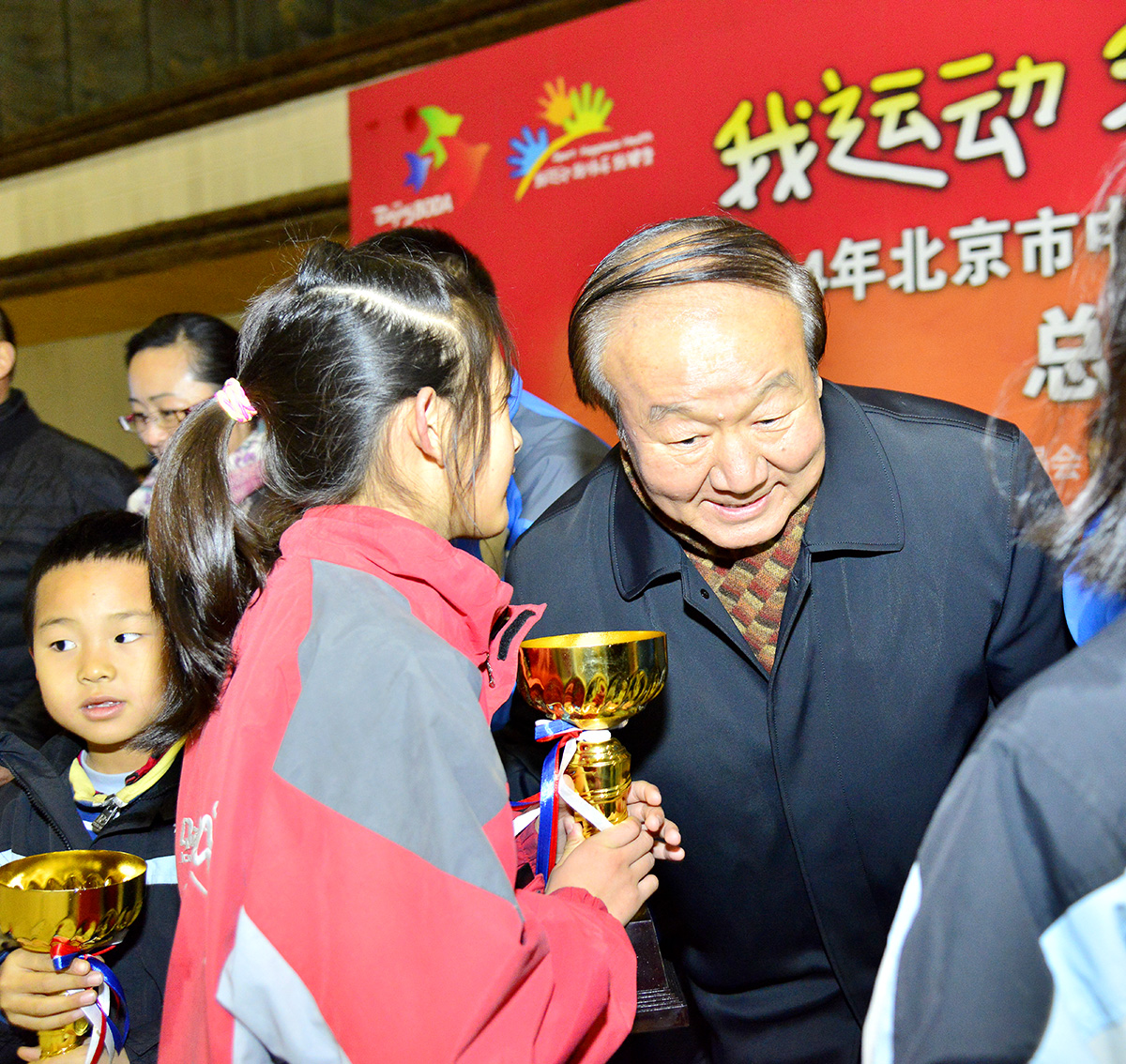 北京奥运城市发展促进会副会长蒋效愚等领导出席活动,向在2014年奥林匹克教育工作中做出突出贡献的团体和个人颁奖,并向“北京青少年申冬奥助威团”学生代表授旗。蒋效愚在讲话中鼓励广大中小学生上冰场、去雪场,参与冬季项目,体验冰雪快乐,以自己的实际行动支持北京和张家口申办冬奥会。