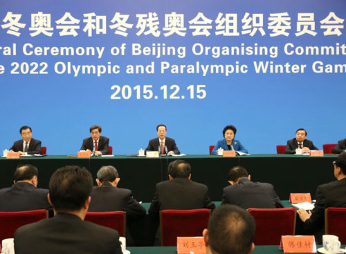 新华社北京12月15日电(记者 王镜宇 汪涌)北京2022年冬奥会和冬残奥会组委会成立大会15日在北京召开。中共中央政治局常委、国务院副总理、第24届冬奥会工作领导小组组长张高丽出席会议并讲话。