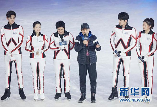 作为奥林匹克历史上第一个既举办过夏季奥运会又将举办冬季奥运会的城市,经历2008年奥运会的“无与伦比”后,2018年韩国平昌冬奥会闭幕式交接仪式上,北京将用一个什么样的“8分钟”来展现自己?新华社记者日前独家专访了参与“北京8分钟”创作的张艺谋团队。这是张艺谋(右三)与参加《跨界冰雪王》的营员在节目录制现场(2017年1月6日摄)。 新华社发