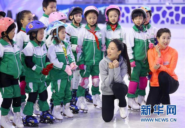 这是冬奥会双人滑冠军申雪(前中)与小学生在冰上互动(2017年3月9日摄)。 新华社发