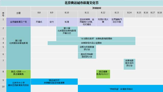 今年与往年有所不同,活动包括全民健身夏日广场、第13届北京国际体育电影周、北京市中小学奥林匹克教育系列活动、奥运人回家——奥运健康跑四个版块。
