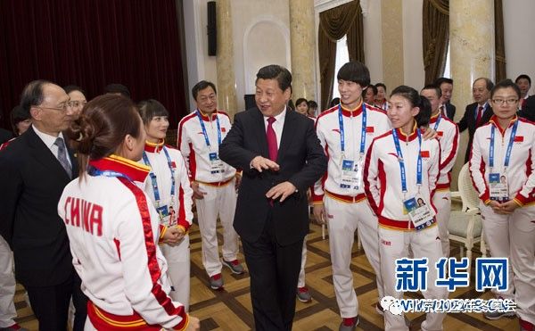 2014年2月7日,习近平在俄罗斯索契亲切看望参加第二十二届冬季奥林匹克运动会的中国体育代表团,同运动员亲切交流。