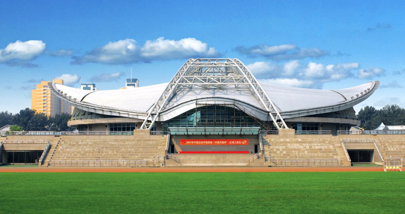 北京理工大学体育馆的屋面结构体系采用形象的话来描述,就是提篮式屋顶结构体系,双道圆弧拱形钢桁架作为提篮的把手,下部悬吊整个屋盖体系。这是一种极稳定的结构体系,可以减少跨度,节约钢材。这种结构形式常用于桥梁,用于建筑设计是非常少见的。屋盖体系是由管管相贯的钢桁架组成,为了准确地反应建筑外形特点、受力和传力方式,结构工程师对结构体型、构件形状和大小、构件尺寸和分布进行了艺术整合,显示出清晰的结构逻辑和力学美,为创造美的建筑作品提供了技术保障。