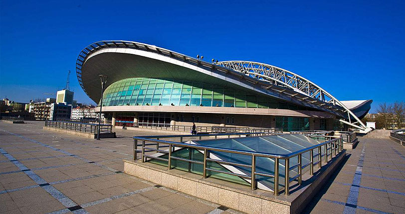 建筑外形由内而外塑造,通过室内空间与外部体形的对应关系产生适宜的奥运建筑形象,整个造型充满动感和力量,虚实有序、舒展奔放,建筑艺术个性和科技特征鲜明。两个弧形巨拱悬挂着波浪形的双曲屋面,其飞翔之势,充分展现奥运建筑的内涵。