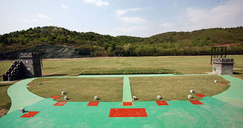 室外竞赛区有6座设计成长城烽火台样式的靶房。从看台上看去,这6座由灰砖砌筑长城烽火台造型的靶房就像是缩小版的万里长城。此外,竞赛区的挡弹墙也同样设计为长城烽火台造型。
