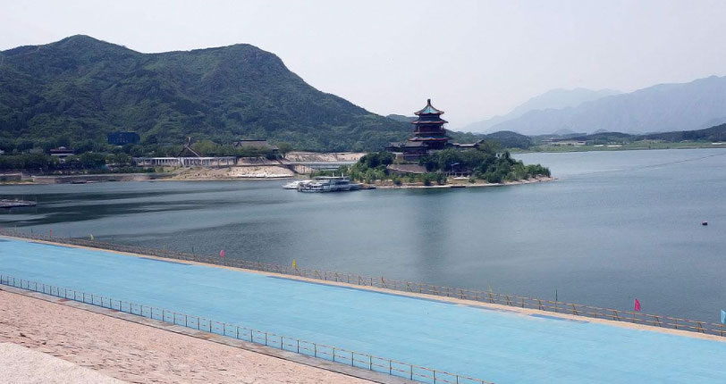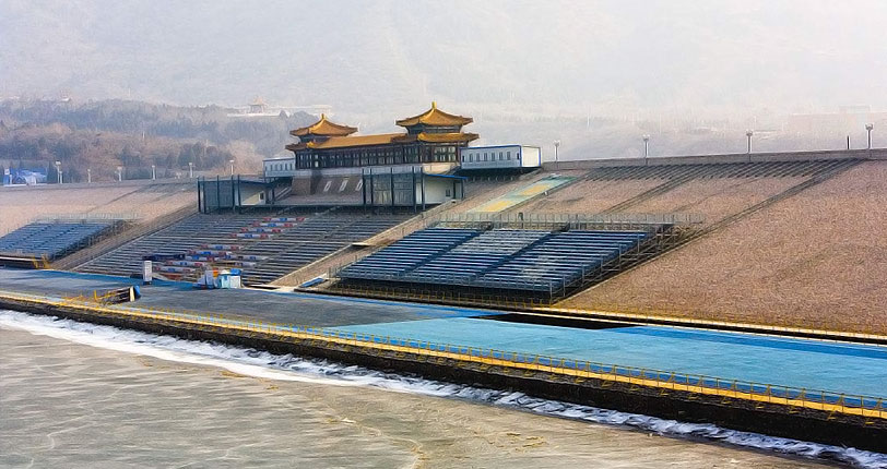 在十三陵水库坝顶,有一座古色古香的龙型建筑。张新生介绍说,它叫龙亭,建筑面积300多平房米,是十三陵水库供游客乘凉休息的凉亭。相关人员对龙亭进行了安装门窗、粉饰内部等装修后,它就成了贵宾休息室。真可谓是因地制宜,节俭办赛事。