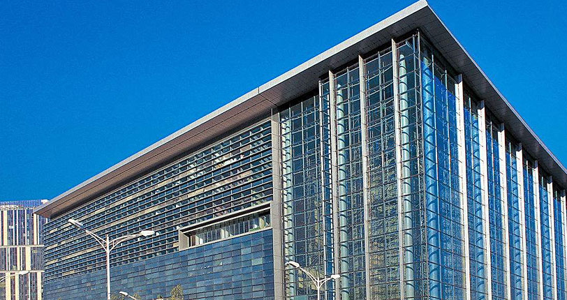 同时,为了防止雨水敲打金属屋顶形成噪声,干扰室内活动。会议中心主体部分的屋顶由内向外采用穿孔铝板、吸音层、隔热层、防潮层、防水层、防雨层等多层复合结构。从而既保证馆内的噪音能够及时被吸纳,又避免了雨水敲击屋顶对馆内形成噪音干扰。