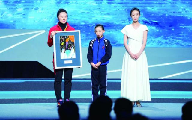 活动现场,参与残疾人青少年冬奥、冬残奥主题绘画作品征集活动的盲人女孩张晰然,将自己以“圣火”为题创作的绘画作品赠送给了带队取得平昌冬残奥会冠军的国家轮椅冰壶队教练岳清爽。