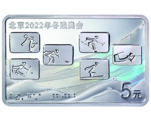 15克长方形银质纪念币背面图案为冬残奥会6个运动项目体育图标,辅以核心图形、雪花、“北京2022”盲文等元素组合设计,并刊“北京2022年冬残奥会”字样及面额。5克圆形金质纪念币为精制币,含纯金5克,直径20毫米,面额80元,成色99.9%,最大发行量5000枚。15克长方形银质纪念币为精制币,含纯银15克,规格32毫米×20毫米,面额5元,成色99.9%,最大发行量10000枚。该套金银纪念币的发行充分体现了国家对北京冬残奥会的大力支持、对残疾人群体的关心爱护。
