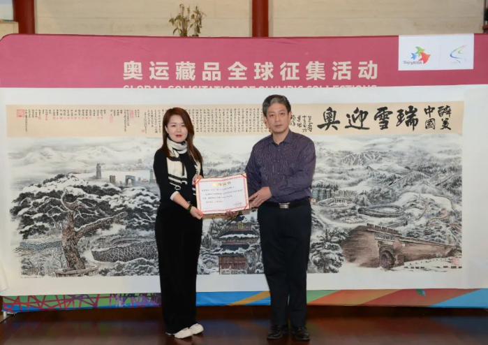 2022年1月12日,奥运藏品全球征集《瑞雪迎奥》水墨雪景国画捐赠仪式在北京奥运城市发展促进会举行。冰雪主题美术创作艺术委员会将众多艺术家集体创作的《瑞雪迎奥》水墨雪景国画捐赠给北京奥运博物馆,以此为北京冬奥会加油,为双奥遗产传承贡献力量。中国画学会创始人、中国当代著名书法家、美术史论家孙克,冰雪主题美术创作艺术委员会秘书长、醉美中国史记山水创始人张诗伟,中国文学艺术基金会关爱基金、常务副秘书长蔺佳,中国体育文化产权交易中心主任王树延等作为捐赠方代表出席了捐赠仪式。