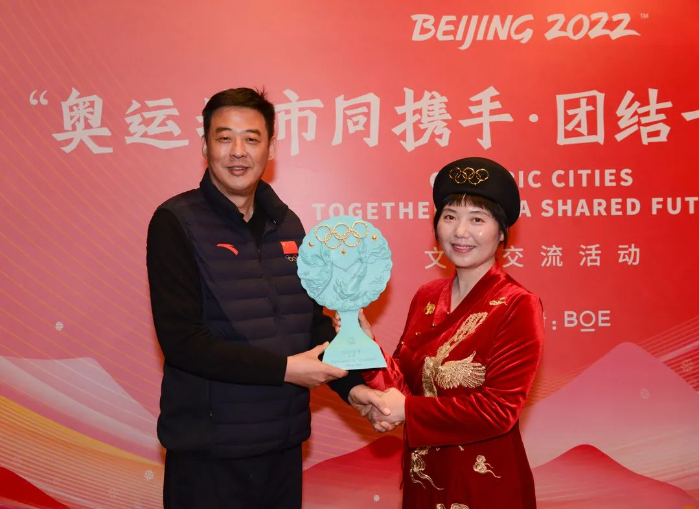 活动中,奥运艺术大使黄剑(右)将北京冬奥会纪念雕塑《同心圆梦》捐赠给北京奥促会,北京奥促会秘书长付晓辉接受捐赠