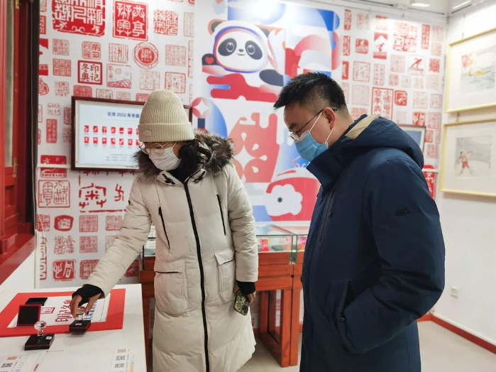 京东方集团副总裁原烽(右)参观“双奥”文化主题展览。