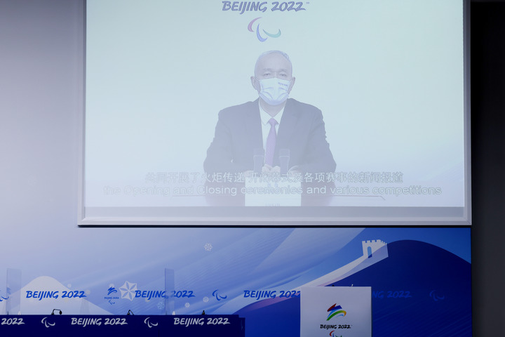 3月13日,北京冬奥组委主席蔡奇以视频形式在发布会上发言。新华社记者许雅楠摄