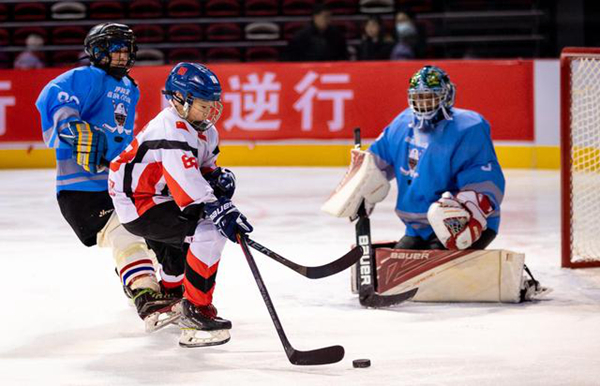 2021年12月29日,在内蒙古呼和浩特市体育中心,冰球小选手在比赛中拼抢。新华社发(丁根厚摄)
