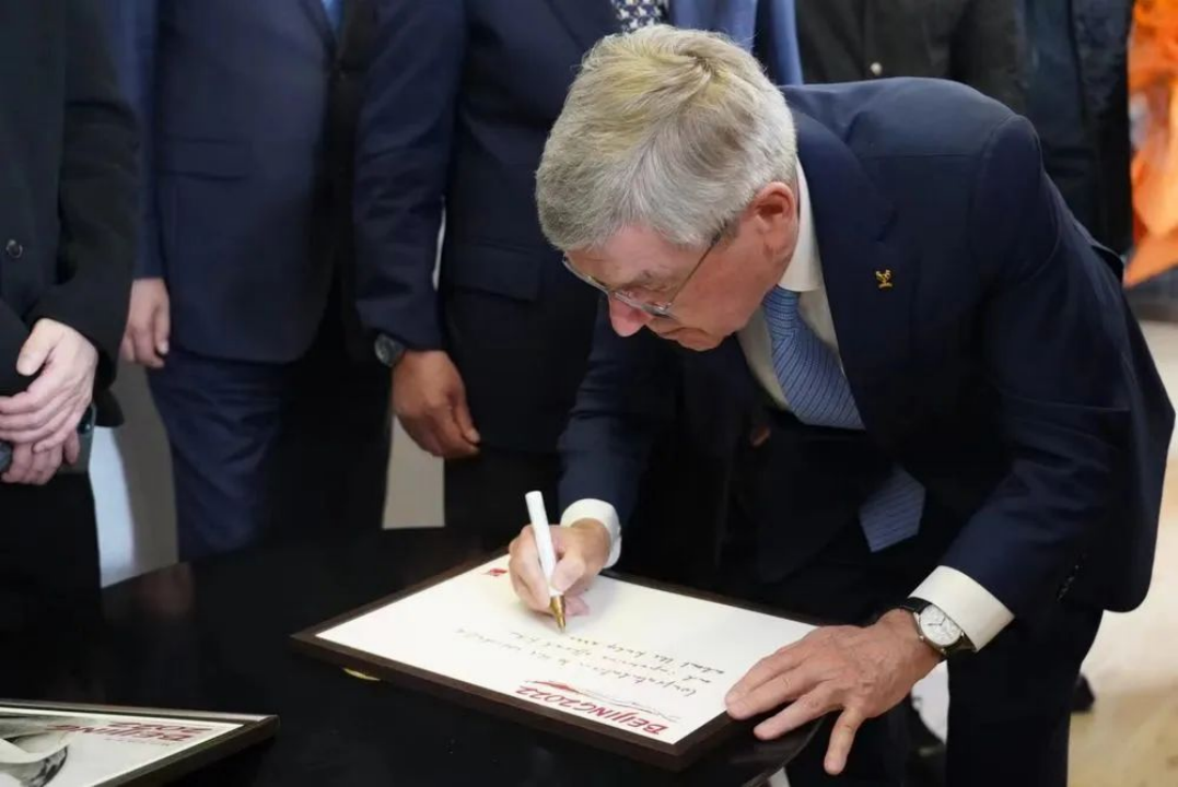巴赫在海报上签名,并将其赠送给北京冬奥组委、北京2008年奥运会和北京2022年冬奥会的“双奥”遗产机构——北京奥运城市发展促进会等。志愿者代表向巴赫赠送了大麦及鲜花。