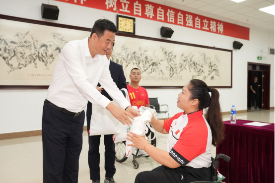 签约仪式上,付晓辉代表北京奥运城市发展促进中心向即将出征杭州亚残运会的运动员代表赠送了北京2008年残奥会纪念品,并鼓励他们奋勇争先、赛出水平,展现风采、为国争光。