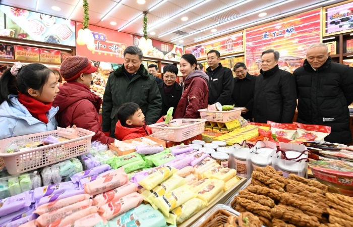 2024年2月1日下午,习近平总书记在天津古文化街考察时,走进店铺同现场群众互动交流。新华社记者 谢环驰 摄