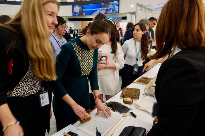 2023年5月2日,在奥地利维也纳联合国城举行的2023年维也纳联合国中文日系列活动上,参访者体验中国传统拓印。新华社发(王宙 摄)