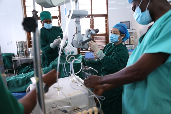 2023年2月23日,在坦桑尼亚桑给巴尔岛纳兹莫加医院,第32期中国援桑给巴尔医疗队的眼科医生董莉莉(右二)与桑给巴尔同事一起做术前准备。新华社记者 董江辉 摄