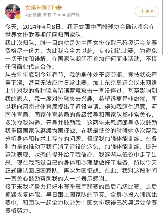 朱婷在社交媒体上发文说:“今天,2024年4月8日,我正式跟中国排球协会确认将会在世界女排联赛期间回归国家队。