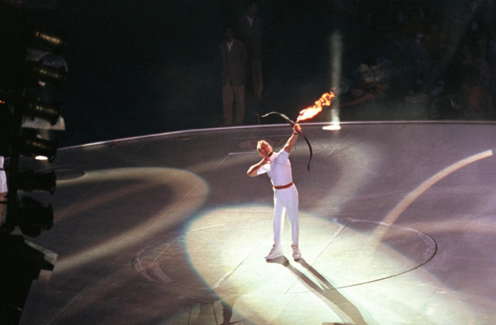 1992年7月25日,第25届巴塞罗那奥运会开幕式上,西班牙神箭手安·雷波略射箭点燃火炬。新华社记者 官天一 摄