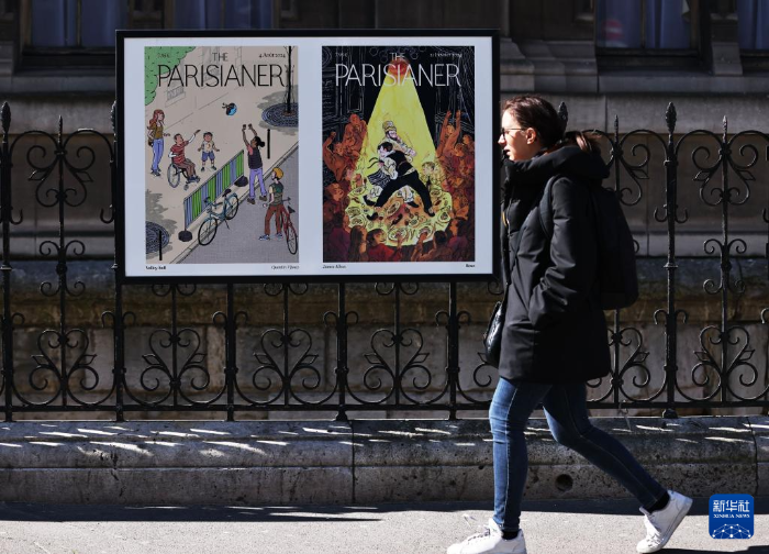4月23日,在法国巴黎市政厅附近,人们经过“巴黎城里的体育运动”主题海报。新华社记者 高静 摄
